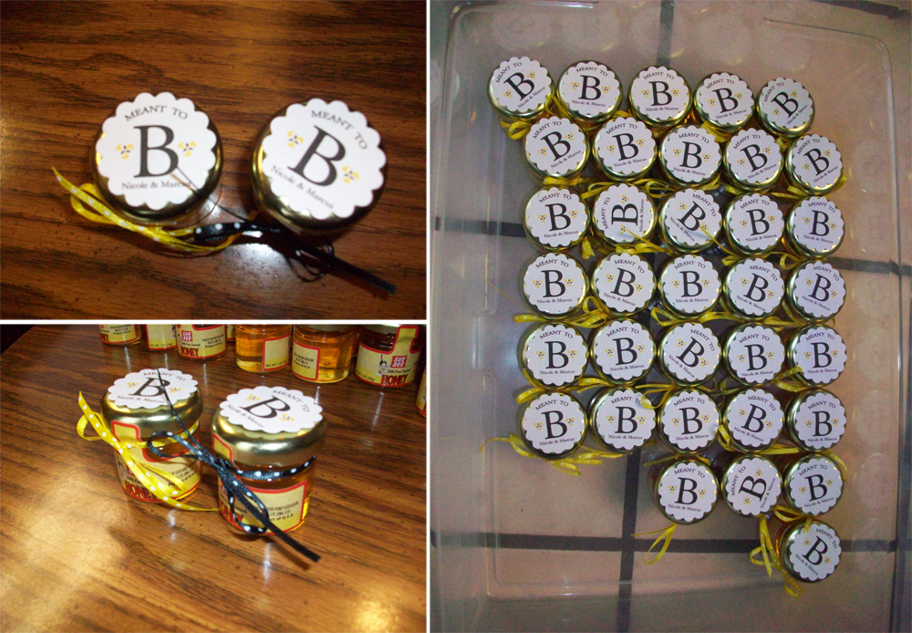 Resolutions to Keep Update: Thank God for my mom! She is THE BEST. Here are a few “in progress” pics of our wedding favors. My Matron of Honor (and older sister) Marissa came up with the ‘Meant to B’ saying for the labels, playing up both the honey producer and my new last name, Branstad. Cutest!