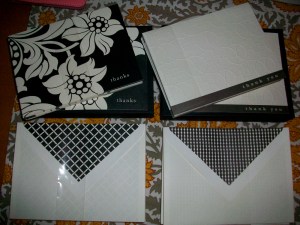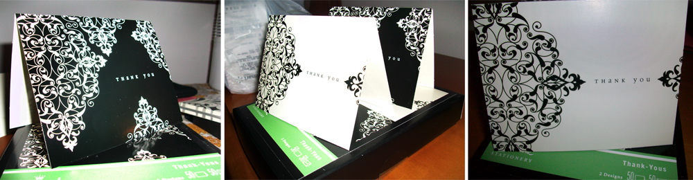 Thank Yous X 200 Update: So I went out and about tonight to look for the perfect thank you note cards that would be in our wedding color scheme but wouldn’t be too expensive since I have to purchase many of them. I found what I was looking for at Wally World.