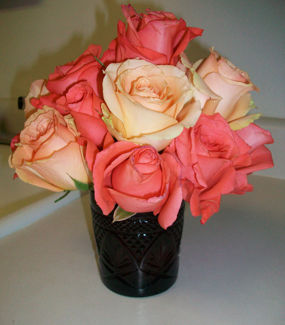 Everything is Rose-y Update: The dry-run is complete and here is what the arrangements are going to look like. The roses were purchased from Trader Joe’s – $5.99 per dozen. WHAT A GREAT DEAL! (Hint, hint to any gentlemen who are looking for flowers on Valentine’s Day – cough, Marcus) I did use floral foam to keep the roses in place within the glass. I can’t wait to see how the table turns out this weekend!