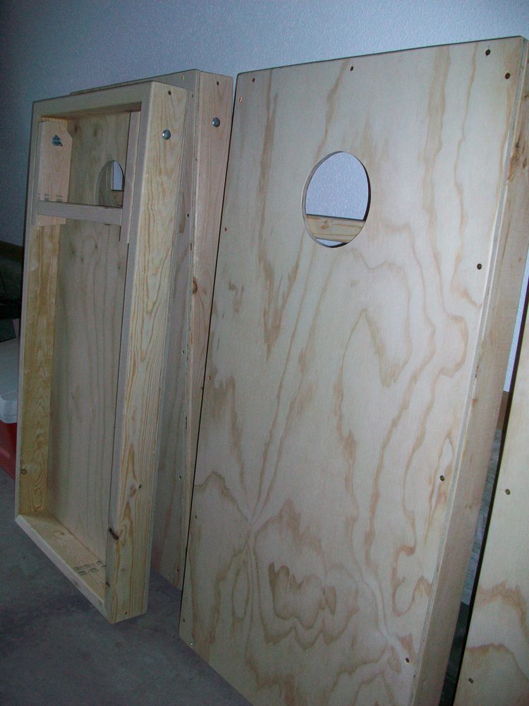 It’s All Fun and Games Update: I have my work cut out for me this weekend. Tonight we popped into Lowe’s to get the goods for priming and painting the bags sets. Here they are in all their bare, unpainted glory.