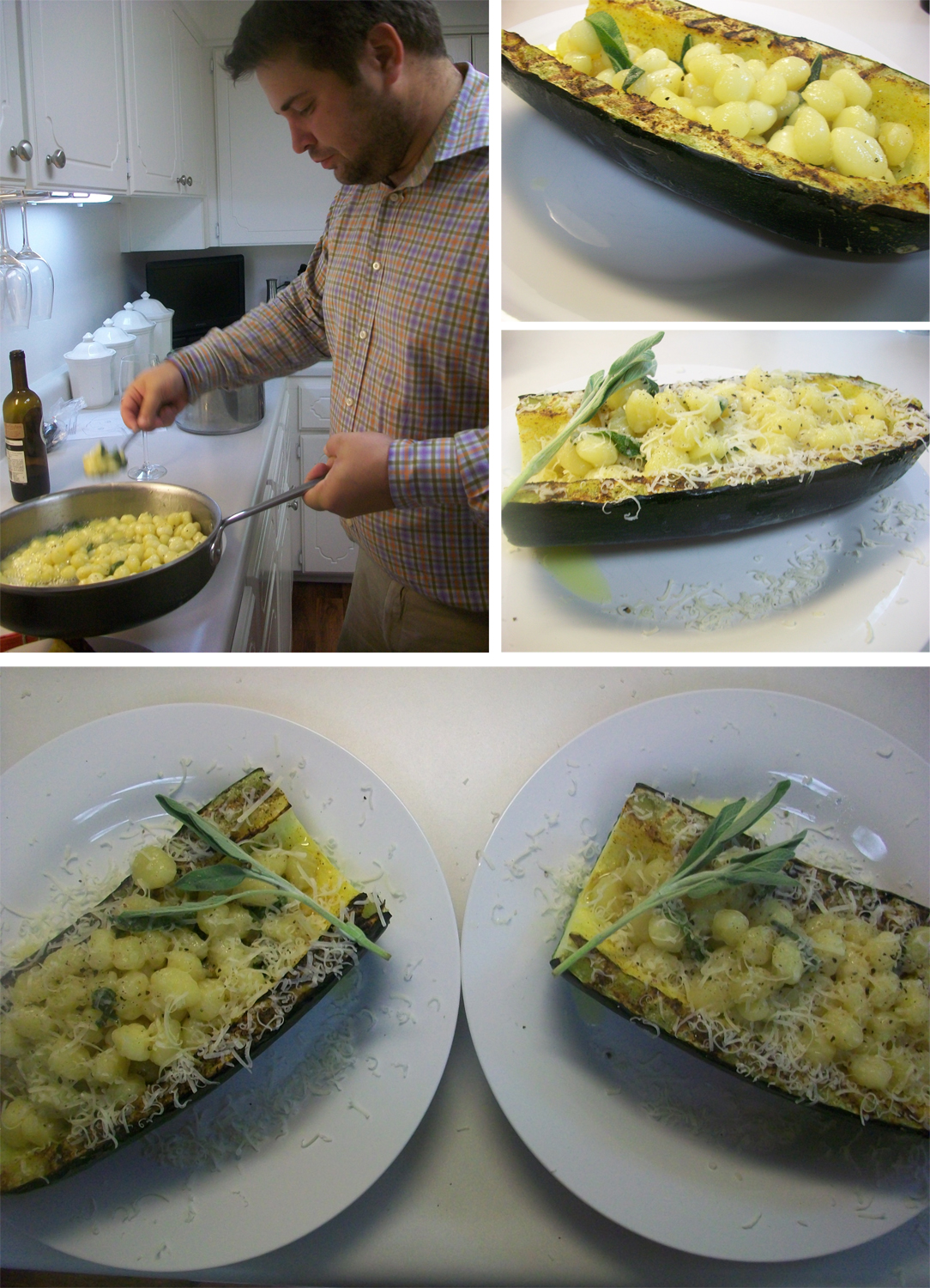As a sweet gesture (probably because he was actually buying wine when he wasn’t supposed to be) my husband picked up and cooked one of my favorite things for dinner tonight – gnocchi. Not only did he recreate one of my favorite dishes, but he used the massive zucchini we got from my sister’s garden to serve it in.