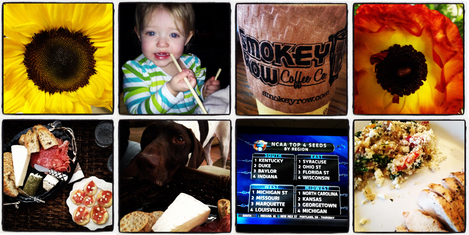 Fresh flowers from Trader Joes, sushi with the Bean, Sunday morning breakfast, a sweet spread, Karl begging, March Madness and Mediterranean Quinoa Salad.