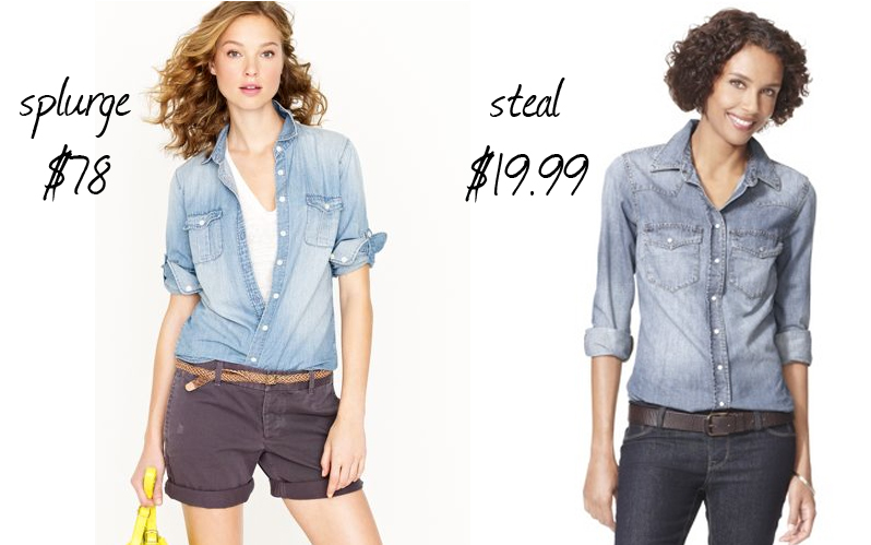 This weekend I hit the denim jackpot. I have been lusting over this shirt from J.Crew for quite some time, but just couldn’t pull the trigger due to the cost. Enter Target and Merona. Check out this splurge vs. steal comparison – LOVE IT!