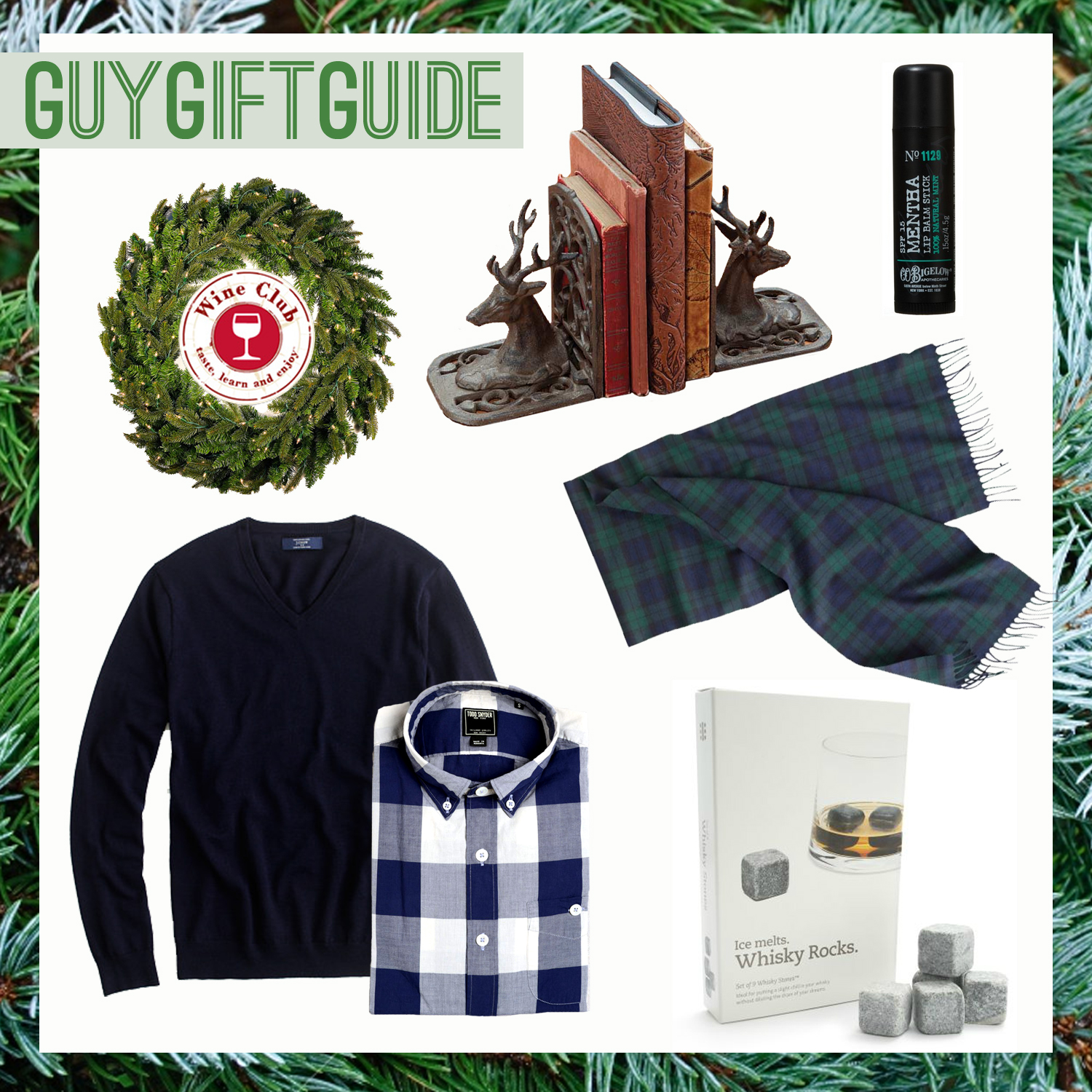 [ wine club, bookends, lip balm, scarf, sweater, Todd Snyder shirt, whiskey rocks ]