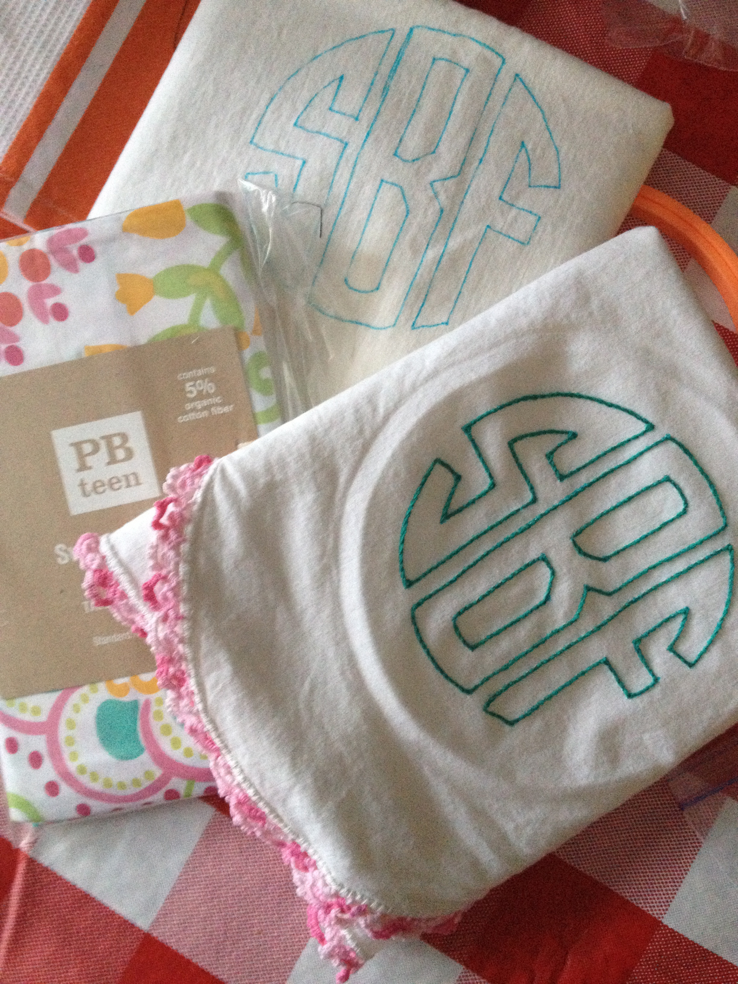After working my hand stitched monogram magic on them, they will be a perfect fit for her new twin beds.