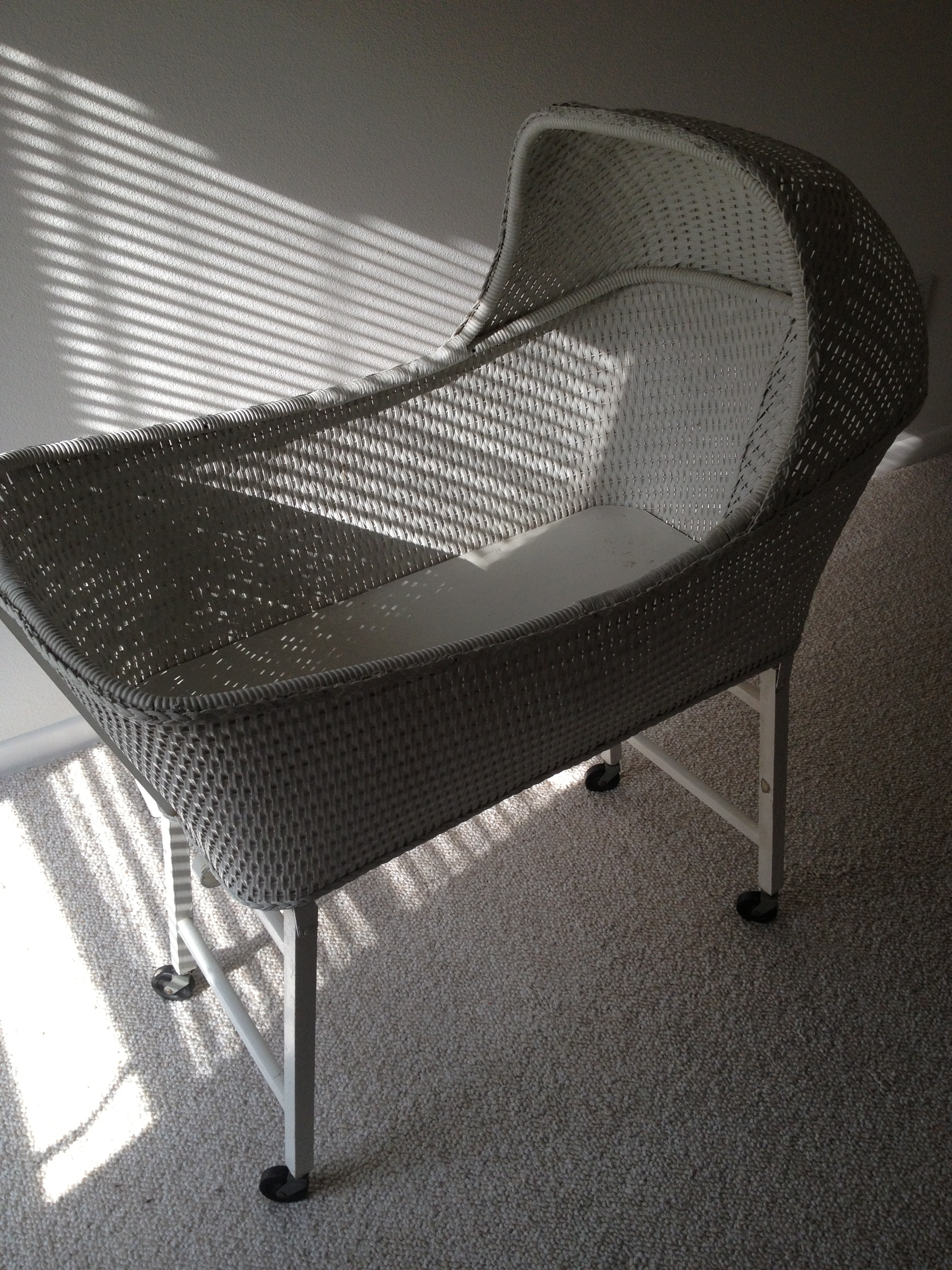 I also found this white wicker bassinet on Craiglist a while ago (i.e. before I was preggers) to go with the rest of the wicker furniture in the room, so I’ve been hanging onto it for Baby B. My mom is quite talented with a sewing machine, so the next project is finding perfect fabric to make a bassinet sheet out of.