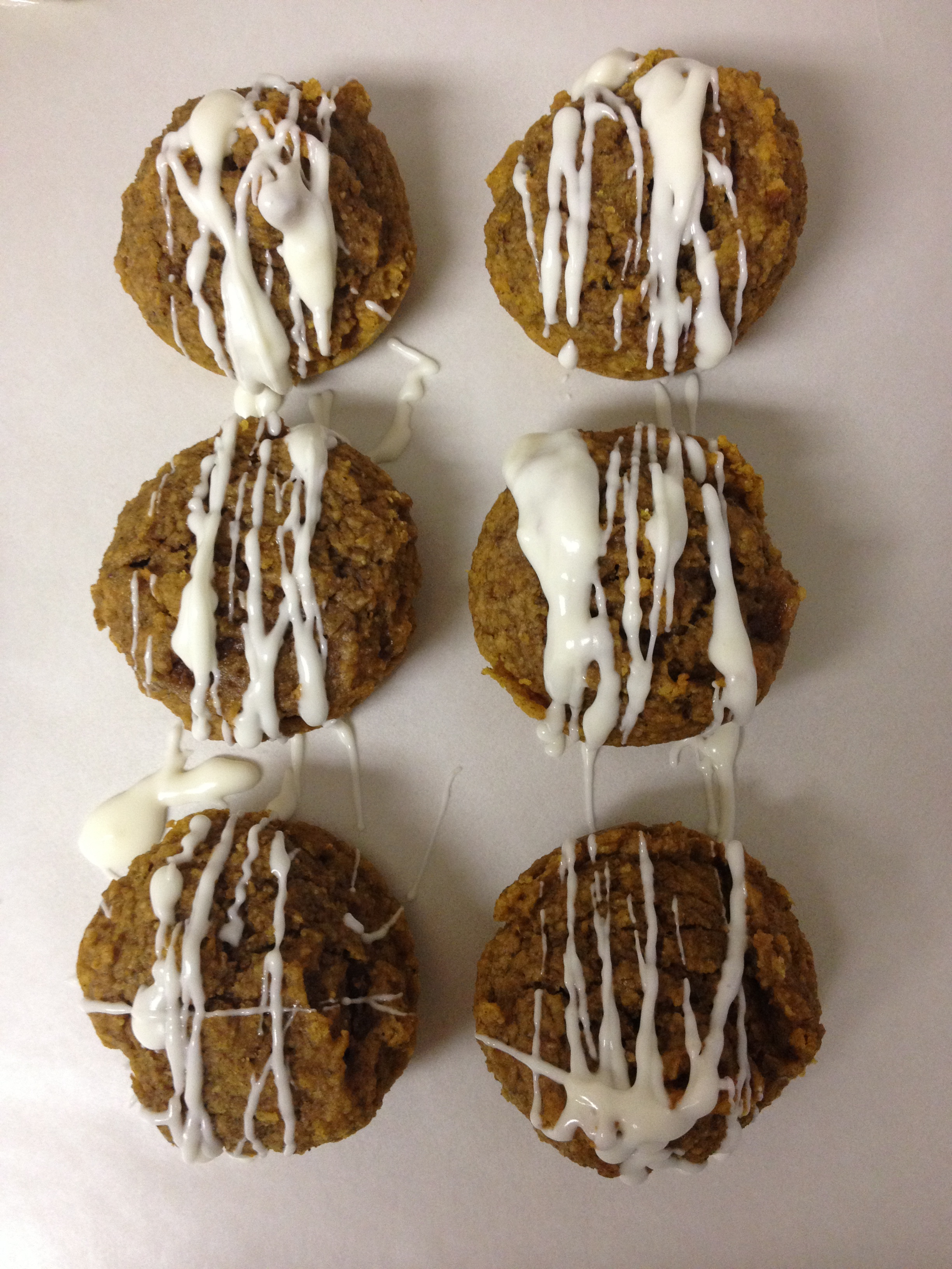 I managed to find a little time late last night to whip up the pumpkin banana muffins and I have to admit, they weren’t exactly a culinary triumph. But, in true pregnant gal fashion, I just drizzled a little cream cheese frosting on top and voila – delicious.