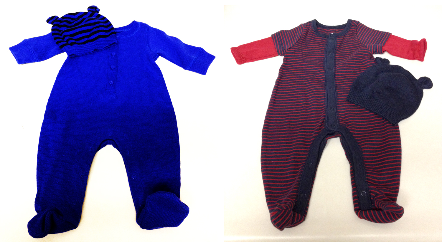 I love the stripe one but I also like the blue, because he will most likely have beautiful blue eyes, and that blue outfit will really make them pop out and show them off even more ~ hard choice but either one very cute!!