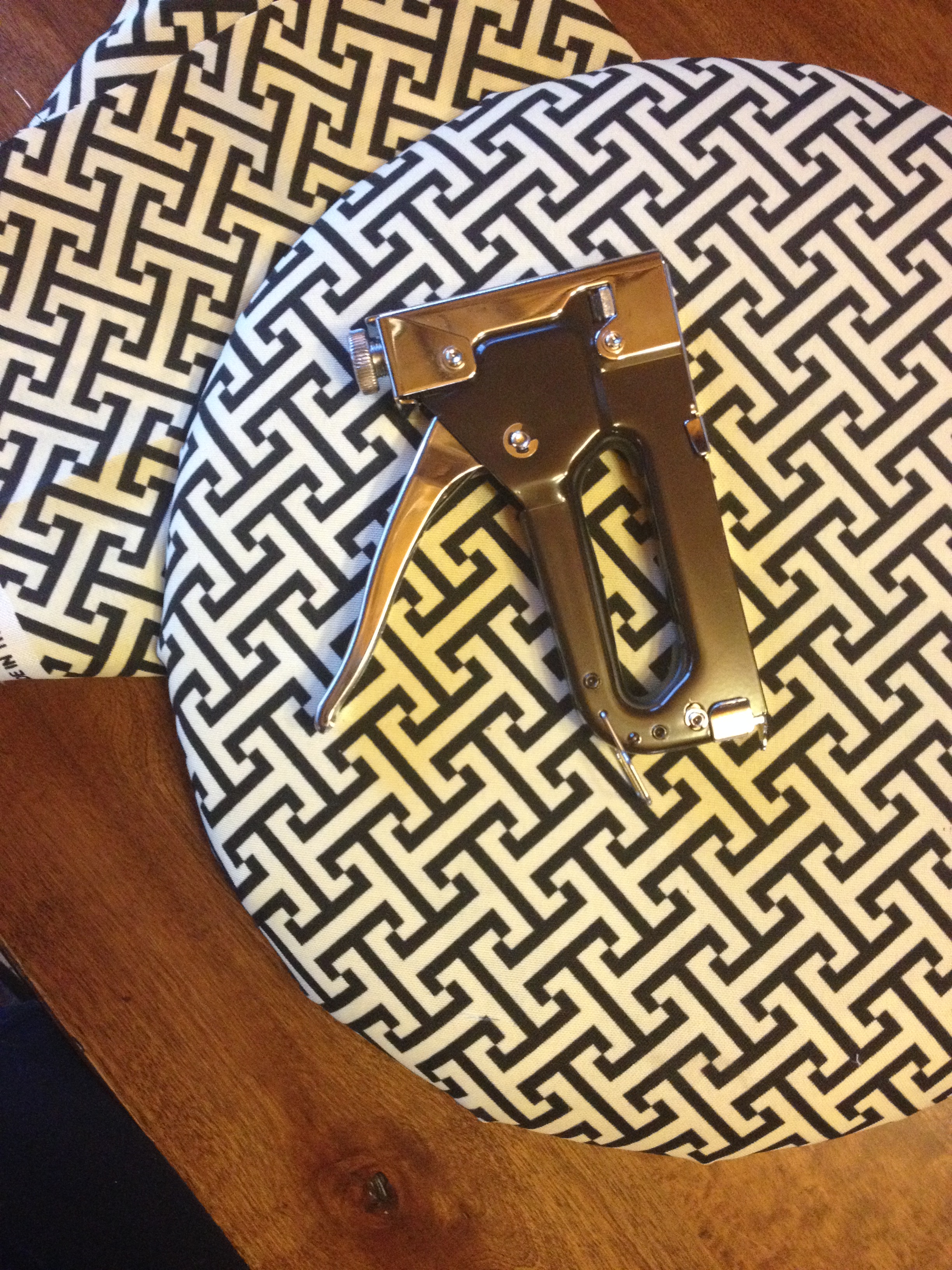 Fast forward to present day and that little set just got another makeover. I picked up 3/4 a yard of outdoor fabric from Jo-Ann’s and made a trip to my local Ace Hardware for a can of Rustoleum hammered spray paint.