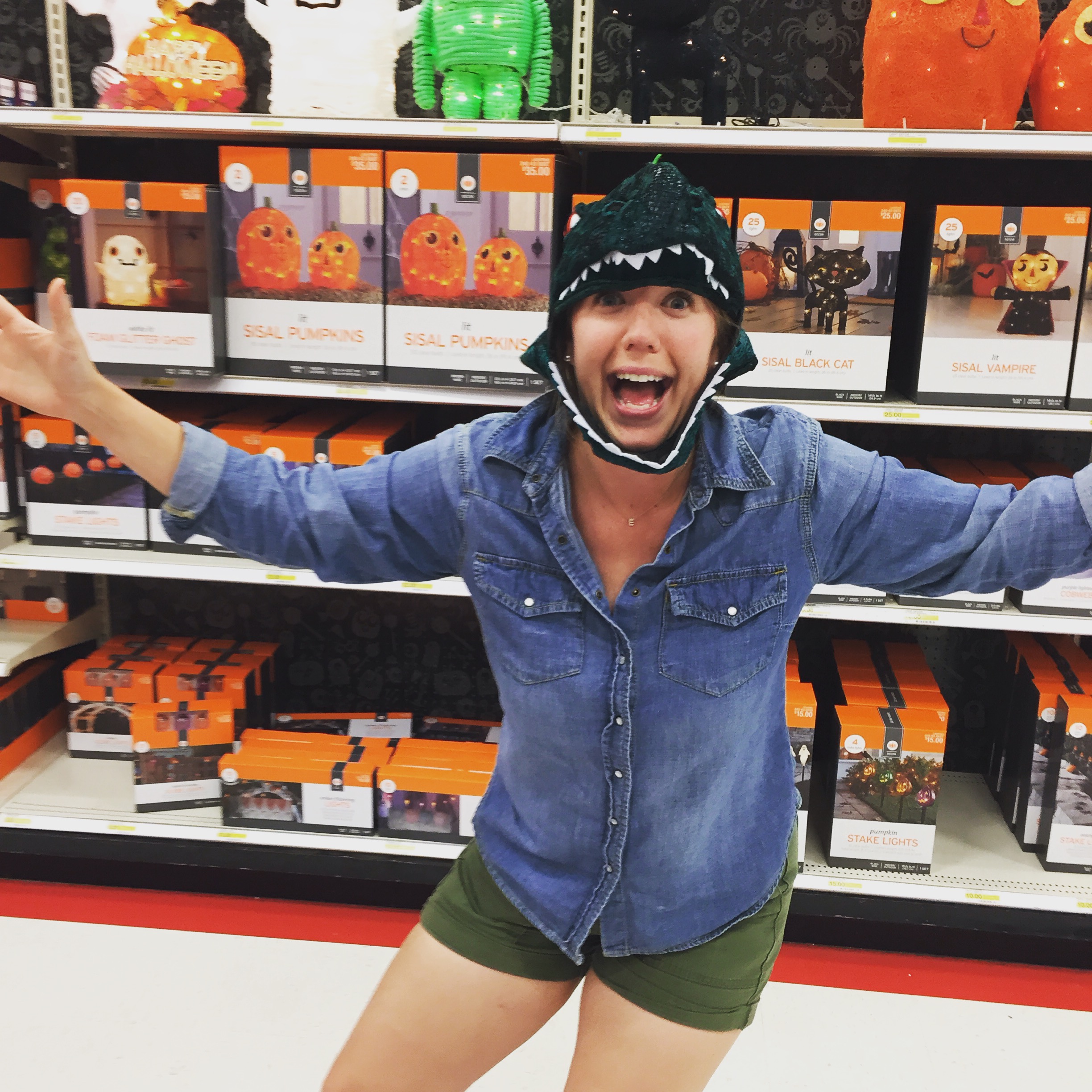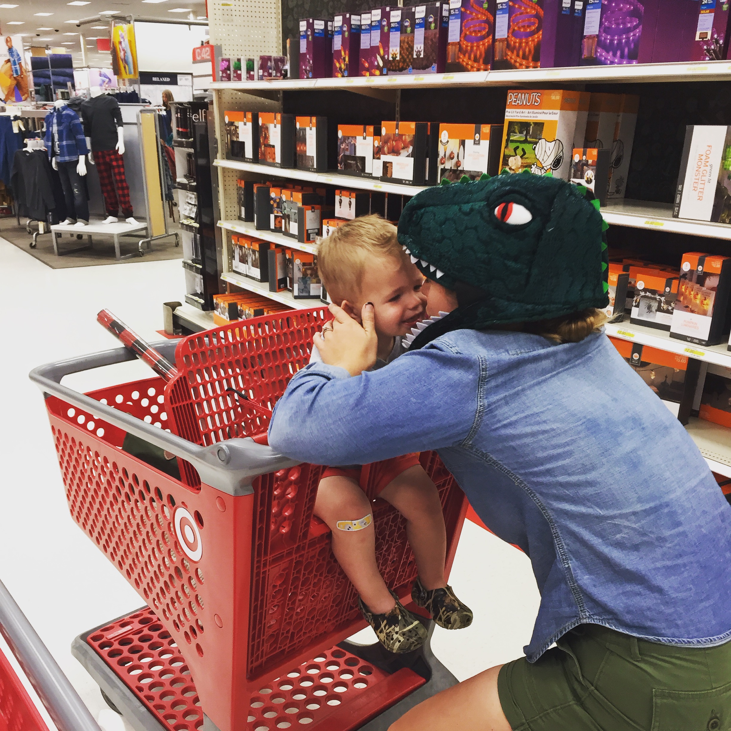 Evie slept through pretty much the entire party, so when he woke up we ventured out for a few more stops, Old Navy and Target. I snagged an awesome, acorn-hued sweater for a steal and played the part of goofy mom while hanging out in the Halloween costume section.